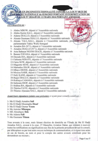 AFRICALEADNEWS- (Sénégal) L’opposition parlementaire a déposé par le biais de ses avocats un recours en annulation de la portant interprétation de la loi d’amnistie. Voici la liste des députés signataires.